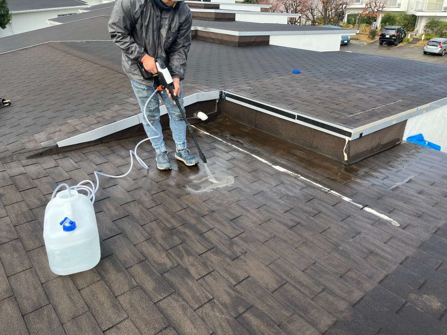 現状の汚れや苔を落とさないと塗り物がくっつかない、